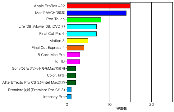 2007年を振り返って頂き、一押しDTV製品・出来事などを投票頂きましたが、今年は、Apple ProRes 422が首位となりました。