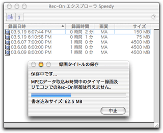 ここまでの操作は、Rec-On単体で出来ることです。逆に言うと、TV録画の際には、Macは無関係な訳で、TV録画のためにわざわざMacの電源を入れる必要がない、TV録画の最中でもMacで他の作業が出来る、といった利点もあります。