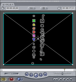 ただし、テキストツールで、「Macでビデオ」は、 というテキストと、"MacDTV.com"というテキストとの2フィールドにすれば、"MacDTV.com"という部分を「横書き表記を90°回転させる)ことで、特に面倒ではなく、本作例を作ることができます。